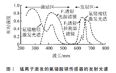随著光纖測溫技術的發展,目前採用一種能夠在長時間内按指數衰減熒光的材料作爲傳感器,所使用的材料,具有耐高溫、化學性質穩定、無電磁幹擾,數據可靠性高等優點,且性價比合理,批量生産,适用於工業溫度測量領域。高效磷光體傳感器選用4價錳離子激發的氟鍺酸鎂作爲傳感器材料。紅色可輻射磷光體傳感器由可見的短波以及紫外輻射所激發,如圖1所示,同時給出用於區分激發與熒光輻射的兩個濾鏡處的透射光譜。